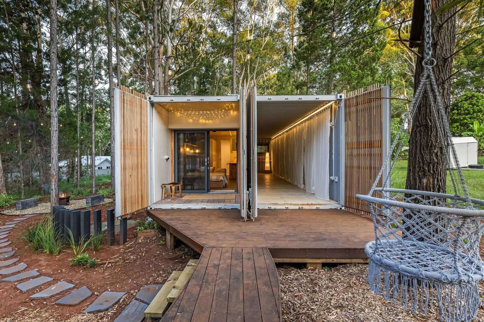 This unique residence is crafted from two 40 foot high-cube shipping containers, seamlessly integrated to offer comfort without compromising on style. Nestled among lush native trees and pines, the home is enveloped by nature reserves, ensuring that the serene environment remains untouched.