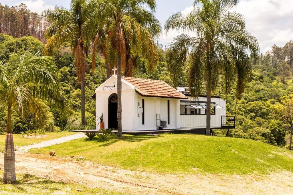 The chapel, which had been abandoned for many years transformed it into a modern home with minimalistic design using shipping containers.